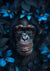 Dette maleri forestiller en chimpanse omgivet af blå sommerfugle og mørke blade, der kigger ind i kameraet med livlige blå blomster og blade mod en kontrasterende baggrund.