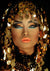 Et portræt af en person iført dramatisk makeup, turkis øjenskygge og koralfarvet læbestift. Hovedet er prydet med en gylden hovedbeklædning bestående af utallige guldpailletter og mønter, hvilket gør billedet visuelt slående og kraftfuldt.