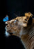 Dette maleri viser et nærbillede af en løvinde, der stirrer på en blå sommerfugl på sin snude mod en mørk baggrund.