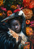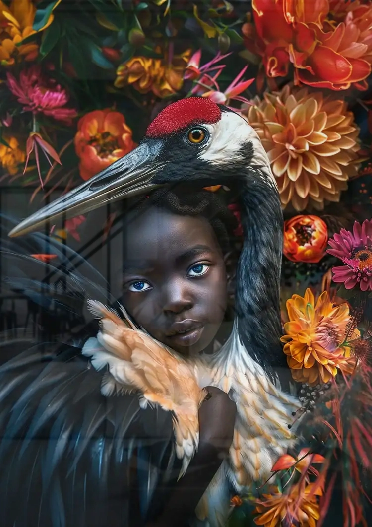Dette maleri forestiller et barn med dybblå øjne, omgivet af livlige blomster i orange, rød og lyserød mod en frodig farverig baggrund.