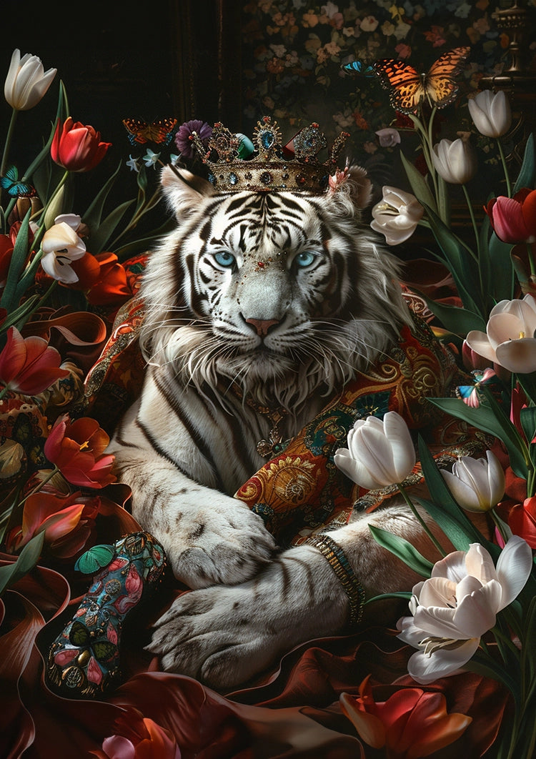 Dette maleri forestiller en hvid tiger iført en juvelbesat krone, lænet blandt farverige tulipaner og sommerfugle, draperet i kongeligt stof mod en farverig baggrund.