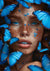 Dette maleri viser et nærbillede af en persons ansigt med fregner omgivet af blå sommerfugle mod en farverig baggrund.