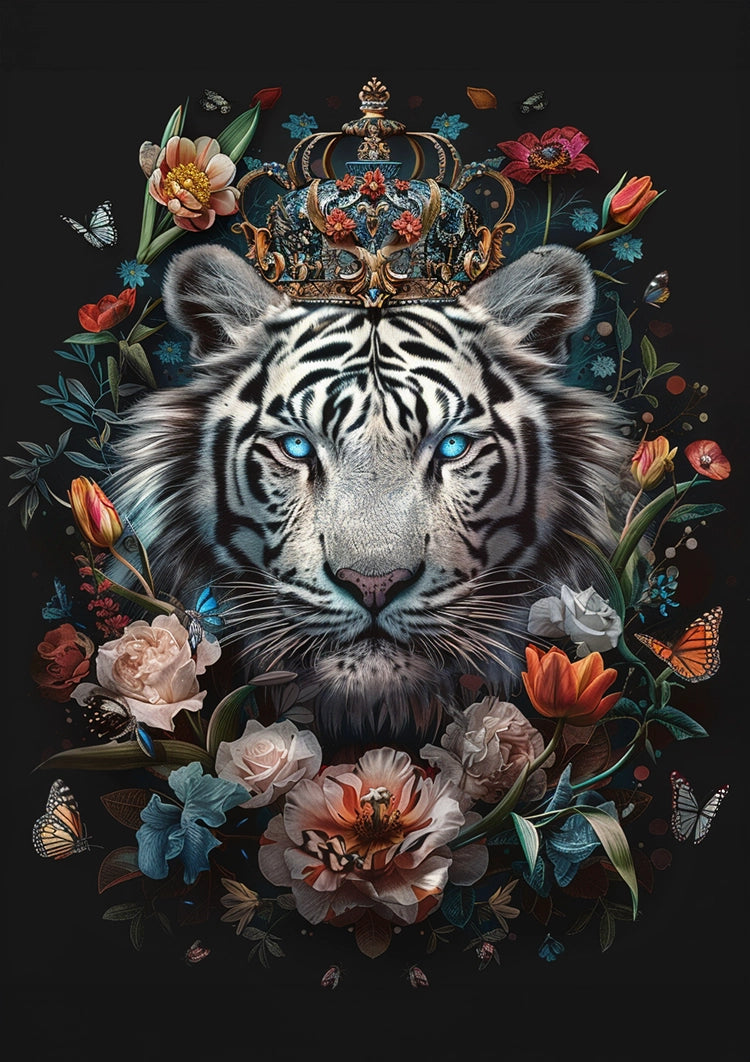 Dette maleri viser en hvid tiger med blå øjne og en krone dekoreret med blomster mod en mørk baggrund med forskellige blomster og sommerfugle.