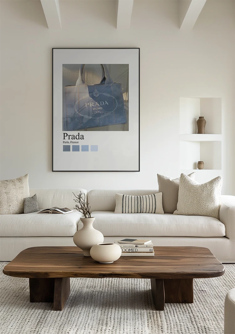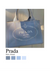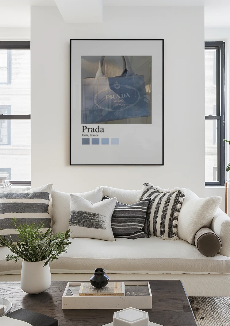 Et lyseblåt muleposemaleri med teksten Prada, Milano og nedenunder teksten Prada, Paris, Frankrig.