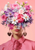 Dette smukke maleri forestiller en lyserød blomsterkvinde med en stor buket farverige blomster, der harmonerer perfekt med den dejlige lyserøde baggrund, hvor hendes skønhed virkelig kommer til udtryk.