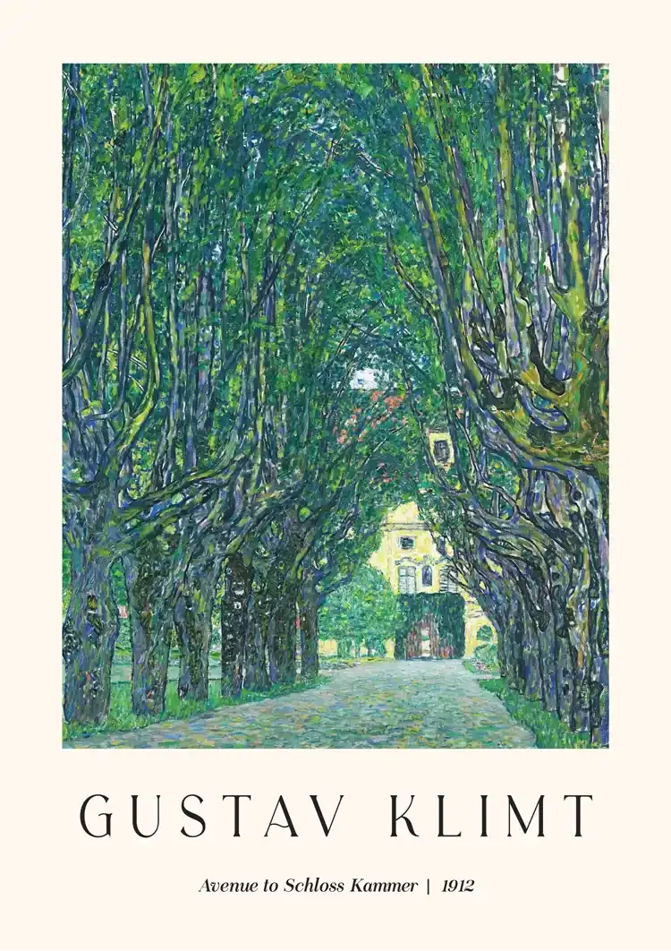 Dette maleri fra 1912, "Alléen til Schloss Kammer" af Gustav Klimt, skildrer en malerisk sti flankeret af træer, der fører til en delvist synlig bygning for enden. Trætoppenes buer danner en beroligende baldakin over stien.