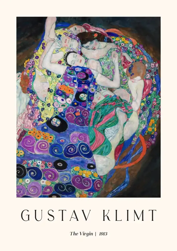 Dette livlige maleri fra 1913 af Gustav Klimt, "Jomfru Maria", skildrer syv sammenflettede kvinder, klædt i livlige mønstre, mod en mørk baggrund.
