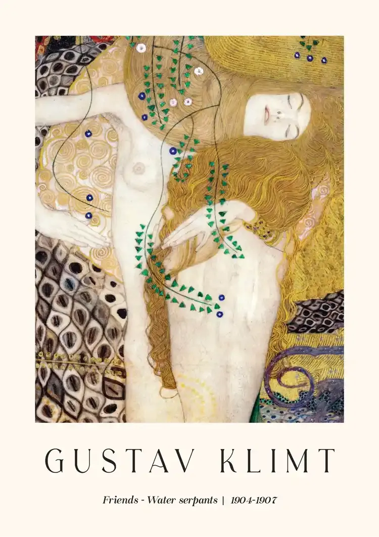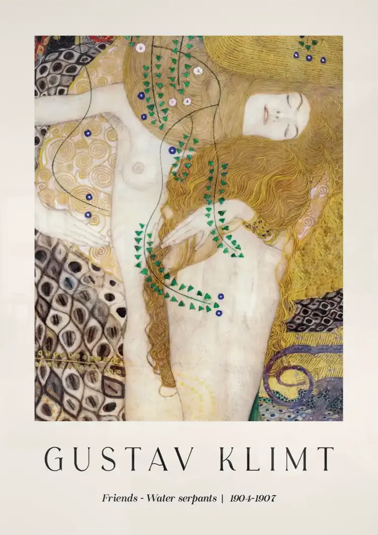Dette kunstværk af Gustav Klimt med titlen "Venner Vandslanger", malet mellem 1904-1907, skildrer to kvindefigurer med dekorative mønstre og bølget hår i en detaljeret og farverig komposition.