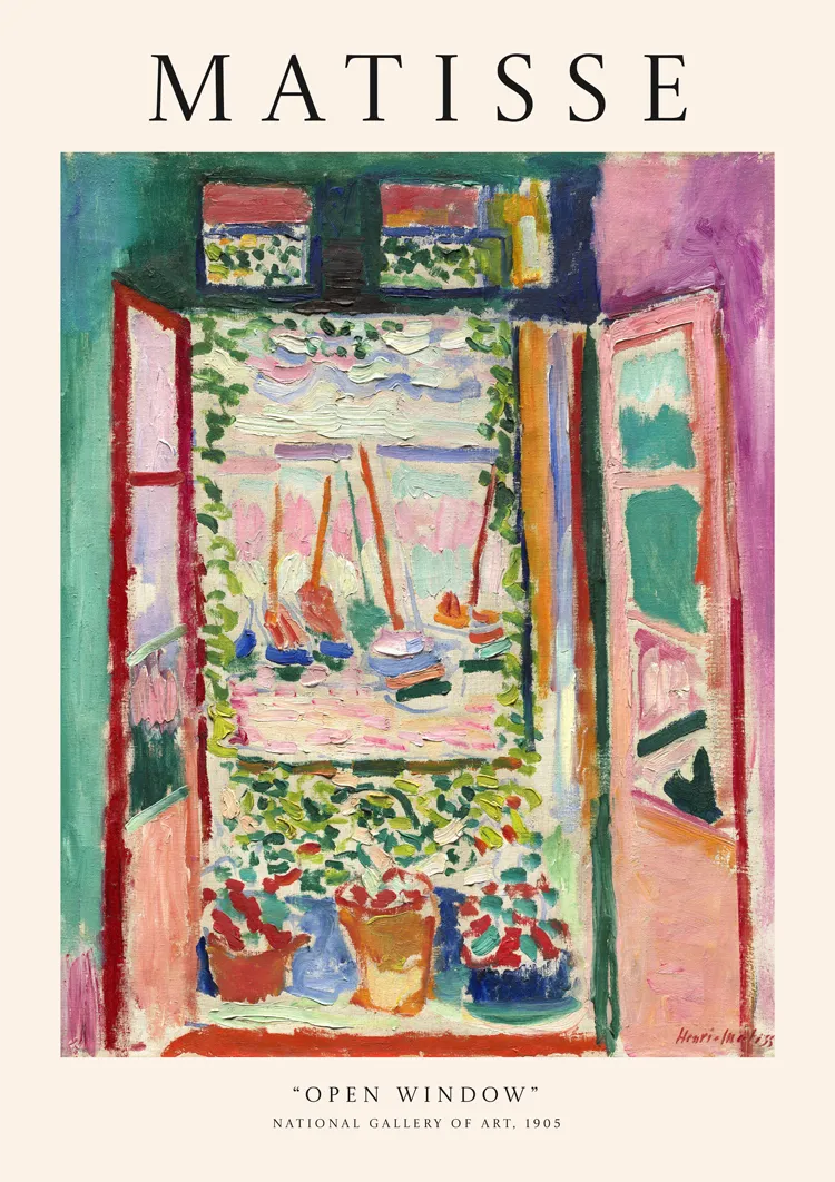 Dette maleri med titlen "Det åbne vindue" af Matisse fra 1905 indfanger lyset og atmosfæren i en fredelig scene med levende farver og dristige penselstrøg.