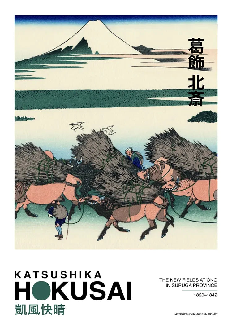Dette maleri "De nye marker ved Ono i Suruga-provinsen" af Katsushika Hokusai skildrer et landligt landskab med arbejdere og okser, der bærer tårnhøje græsbundter, med Fuji-bjerget i baggrunden.