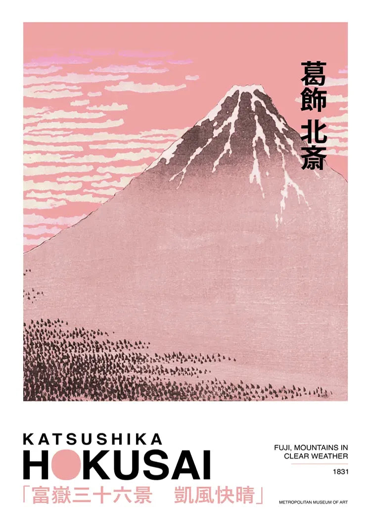 Dette maleri fra 1831 "Fuji-bjergene i klart vejr" viser Fuji-bjerget med en lyserød himmel og kanji-tegn til højre.