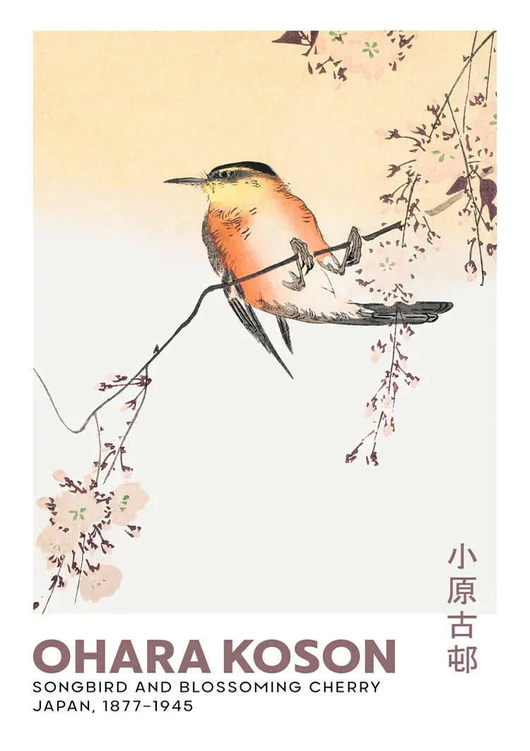 Dette maleri af Ohara Koson viser en sangfugl, der sidder på en blomstrende kirsebærgren.
