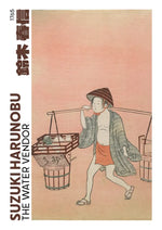 Dette maleri "Vandhandleren" af Suzuki Harunobu fra 1765 forestiller en figur iført traditionelt tøj og en hat, der bærer et åg fyldt med spande vand. Baggrunden er en dæmpet lyserød farve.