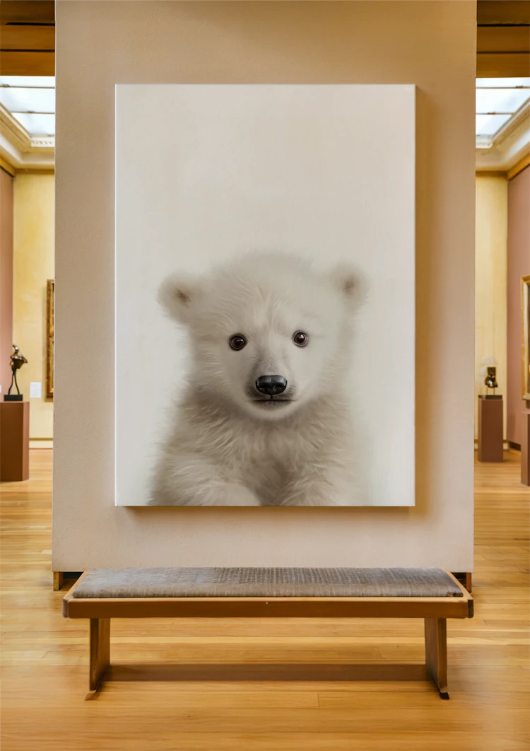 Dette maleri tilbyder et intimt nærbillede af en sød isbjørneunge med fluffy hvid pels, der kigger direkte ind i kameraet. Den enkle hvide baggrund gør, at ungen forbliver fokuspunktet.