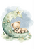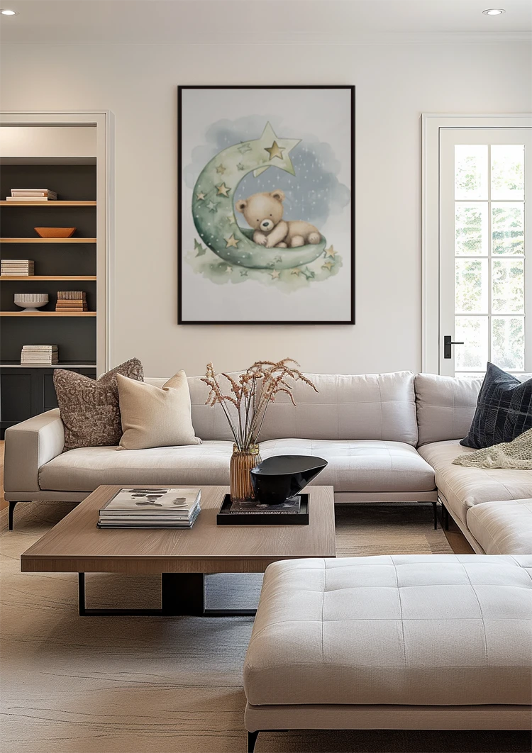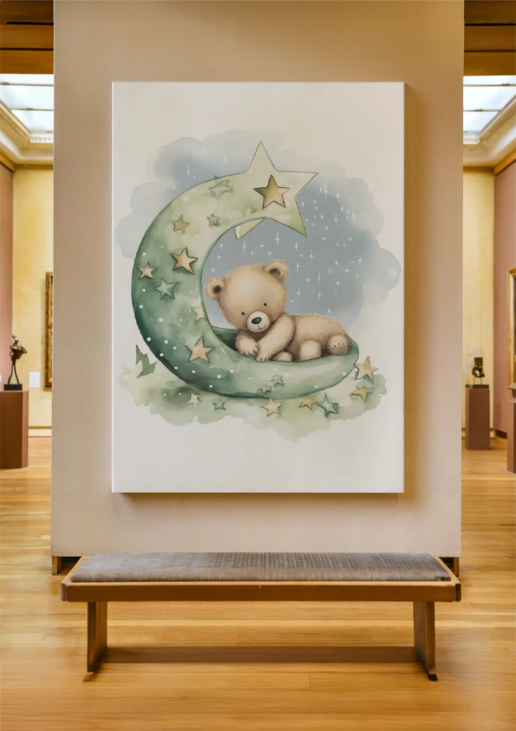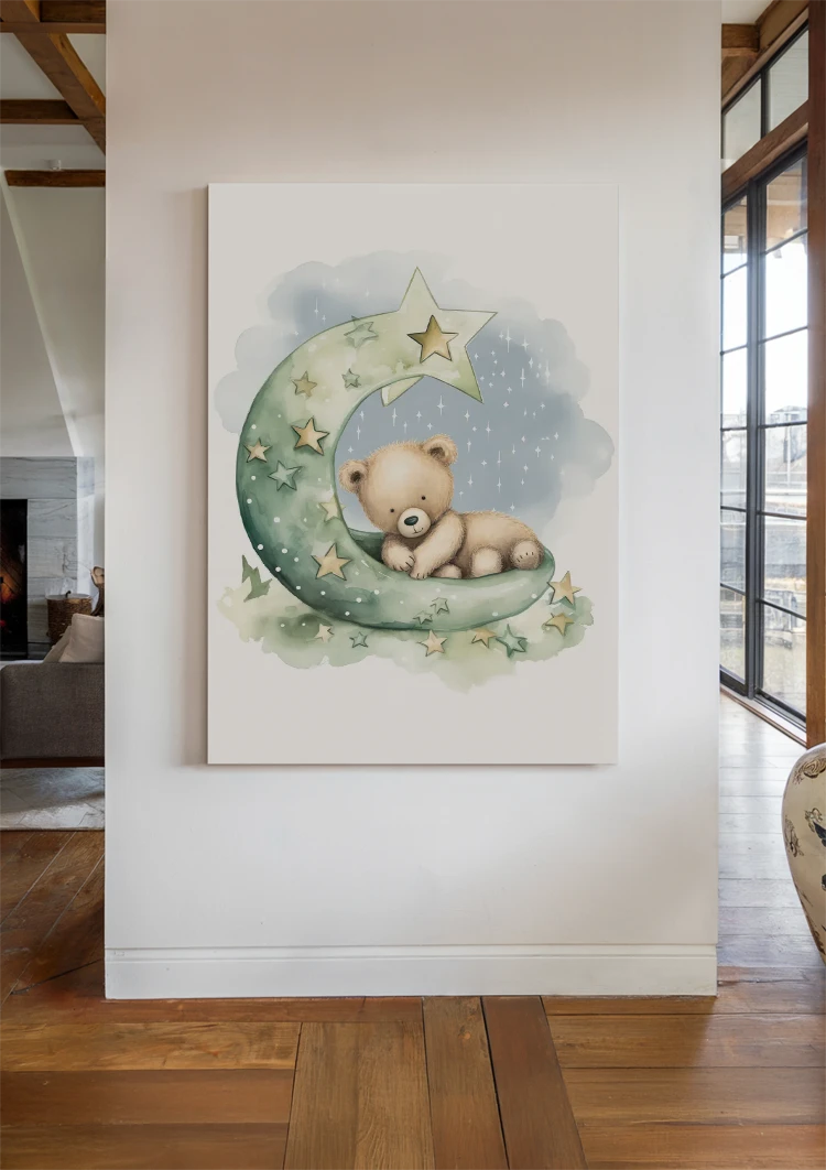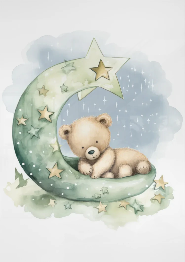 Dette charmerende maleri forestiller en nuttet bamse, der soler sig på en grøn halvmåne, omgivet af funklende stjerner. Den bløde, overskyede baggrund tilføjer et drømmende præg.
