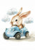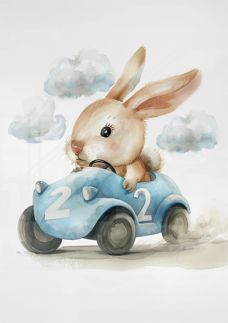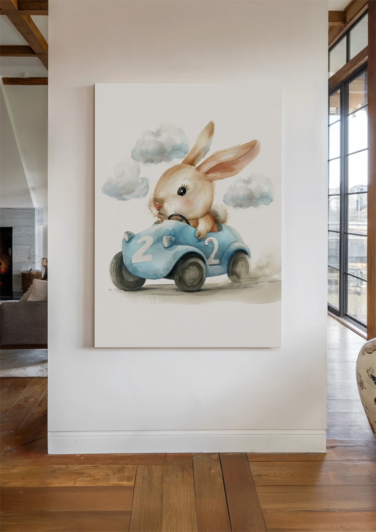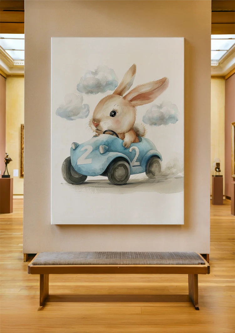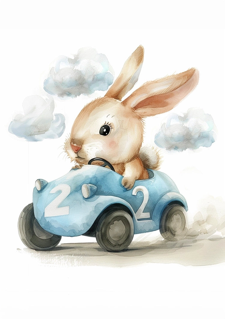 Dette maleri viser en kanin, der kører en lille blå racerbil med nummer 2 på. Kaninen virker fokuseret, mens den kører.