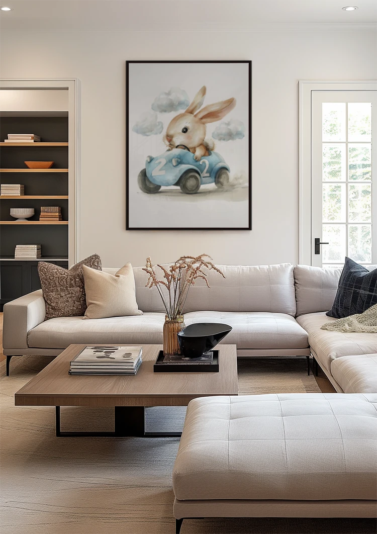 Hvorfor vælge Maleri af kanin i blå racerbil på lærred