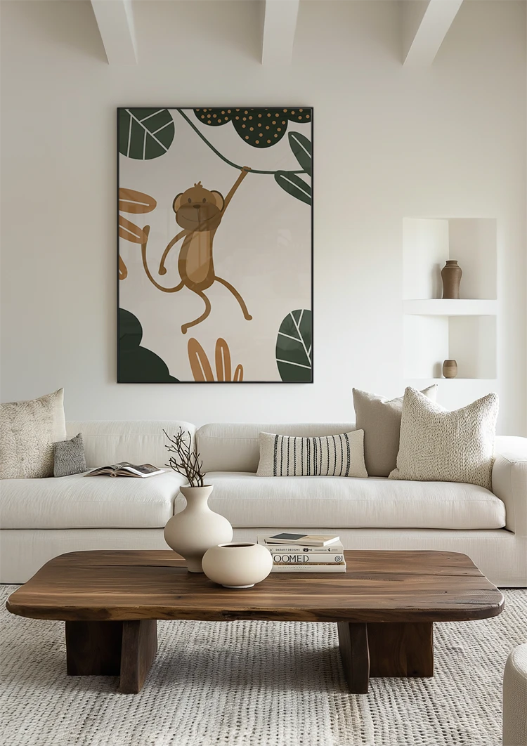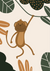 Dette maleri viser en illustration af en smilende abe, der hænger i den ene arm fra en grøn slyngplante.