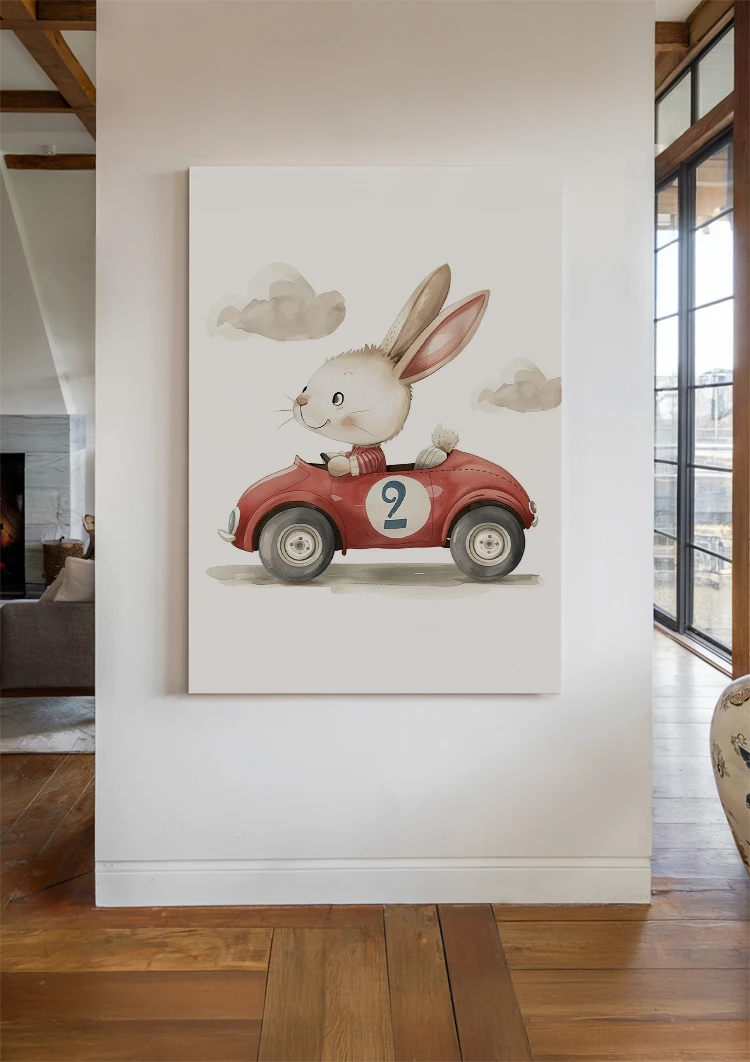 Dette maleri viser en sød kanin, der kører en lille rød racerbil med nummer 2 på. Kaninen kører glad afsted.