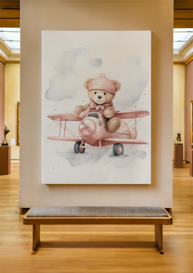 Dette maleri forestiller en bamse iført en sød lyserød hue og tørklæde, der sidder i cockpittet på et fly i den samme muntre farve.