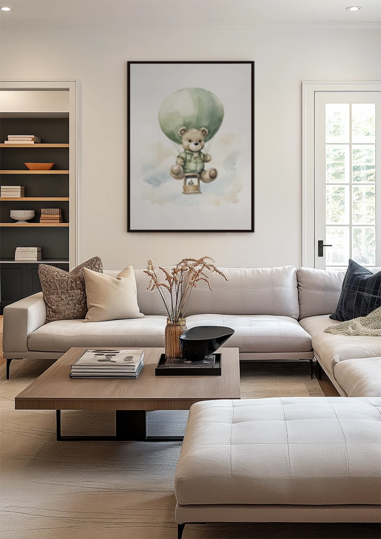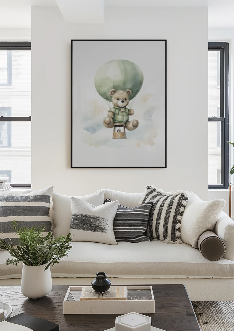 Dette charmerende maleri forestiller en nuttet bamse, der holder en sød grøn varmluftballon. En hjertevarmende scene, der vil bringe et smil frem på dit ansigt!
