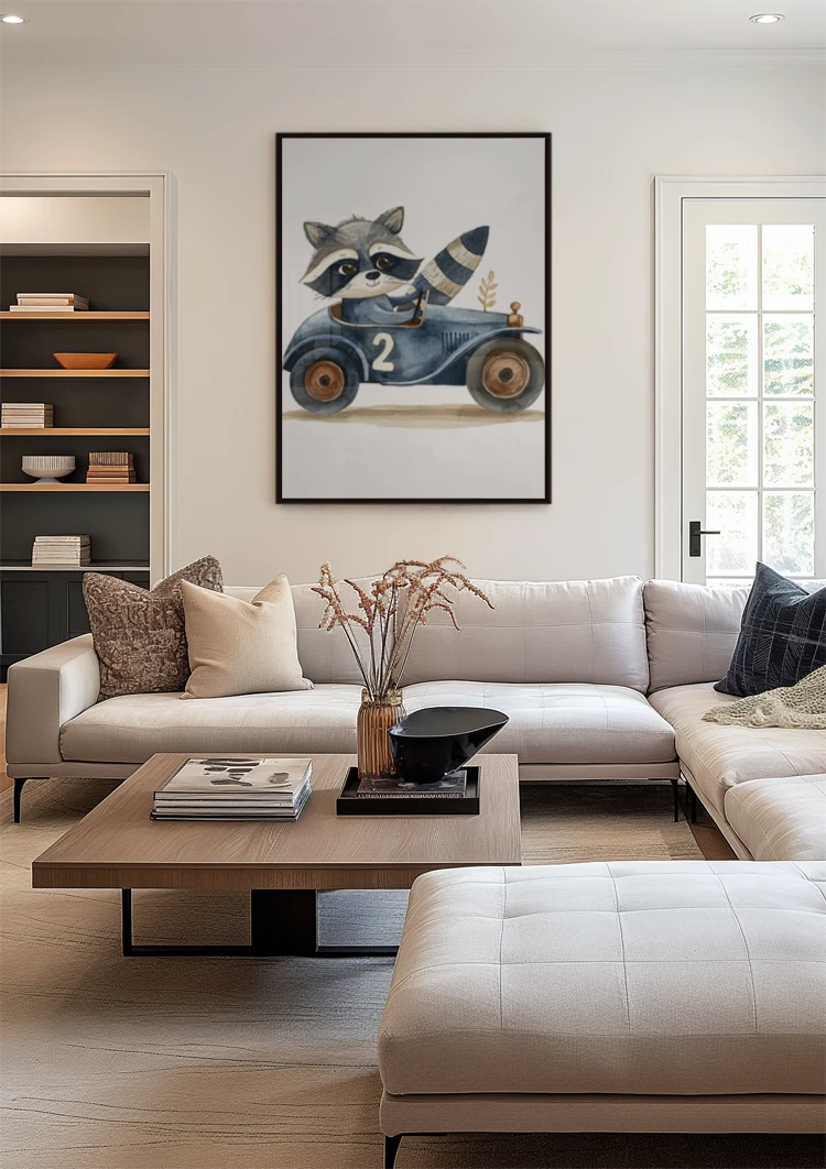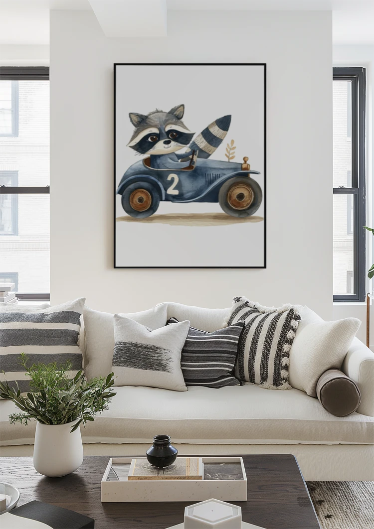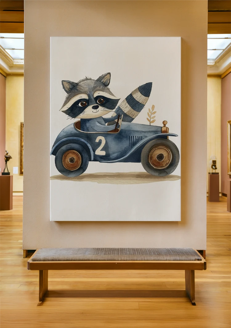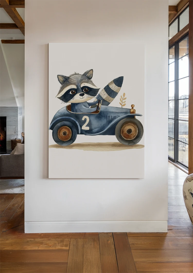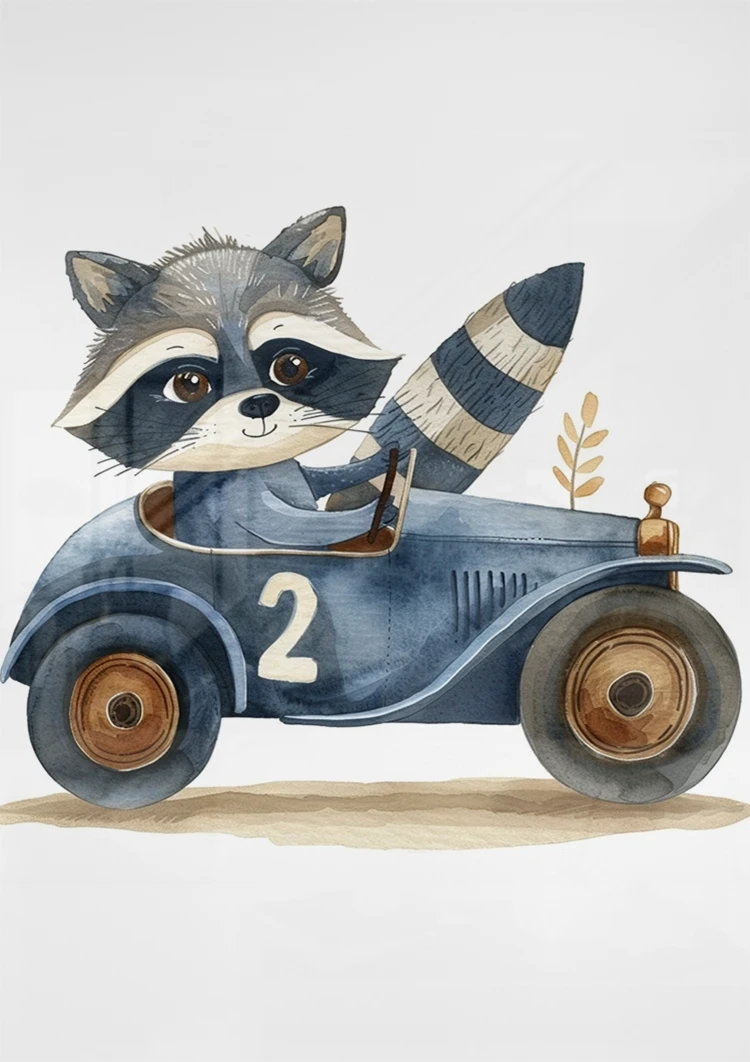 Dette maleri forestiller en vaskebjørn i en cool, blå veteranbil med nummer 2 på siden.