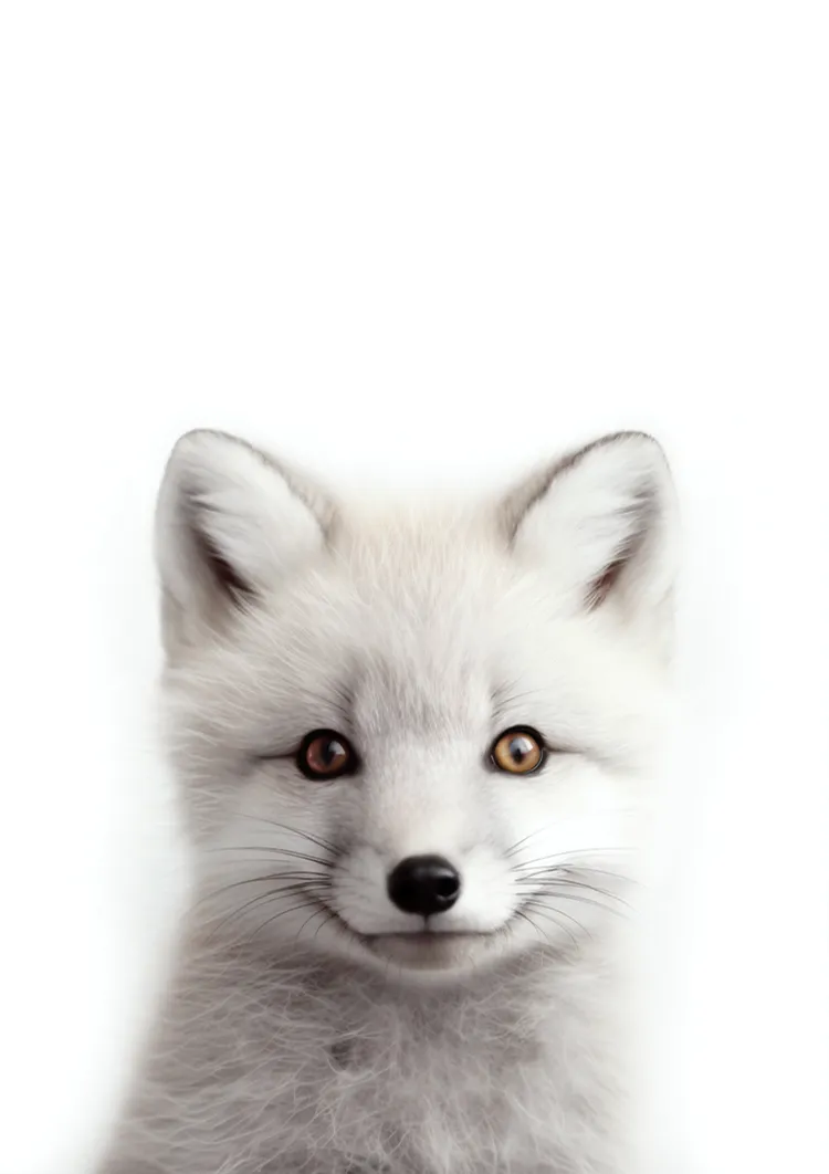 Dette maleri forestiller en hvid ræv med et brunt øje og et blåt øje. Rævens pels er blød og fluffy.
