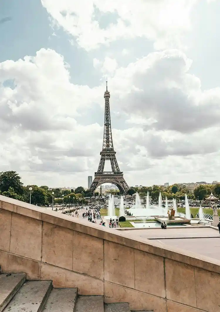 Dette maleri viser en udsigt over Eiffeltårnet fra Trocadero med vandfontæner i forgrunden og de omkringliggende haver.