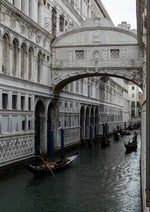 Dette maleri viser Sukkenes Bro i Venedig, Italien, med en gondol, der sejler gennem den smalle kanal.