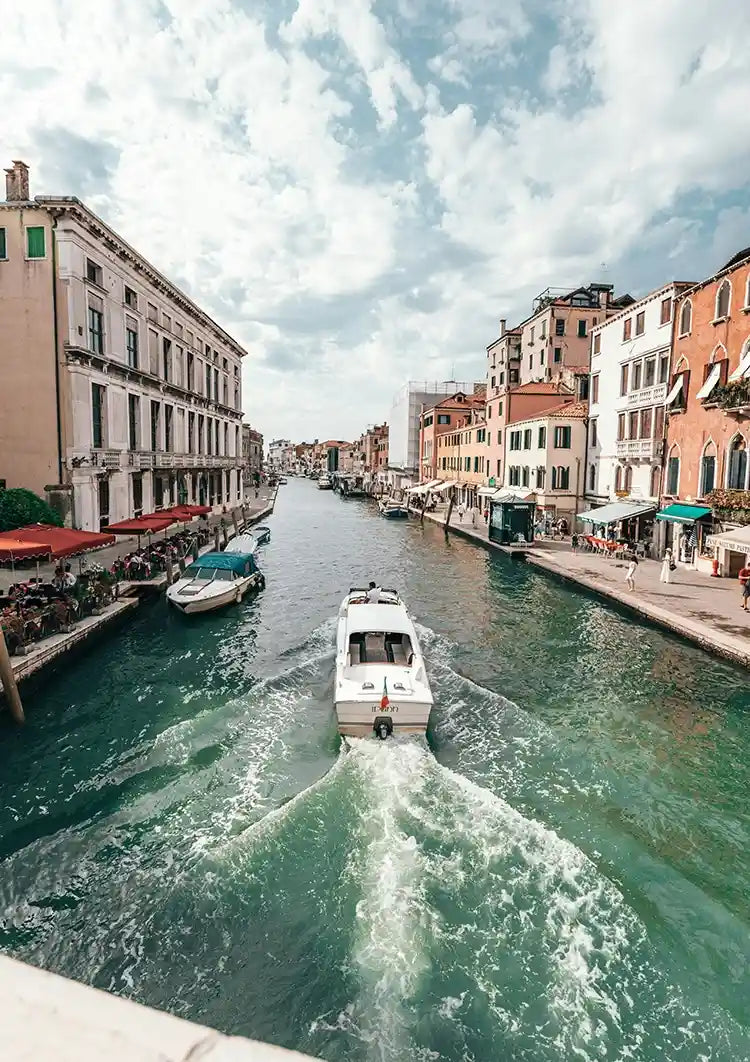 Dette maleri viser en travl kanal i Venedig, omgivet af farverige historiske bygninger.