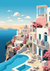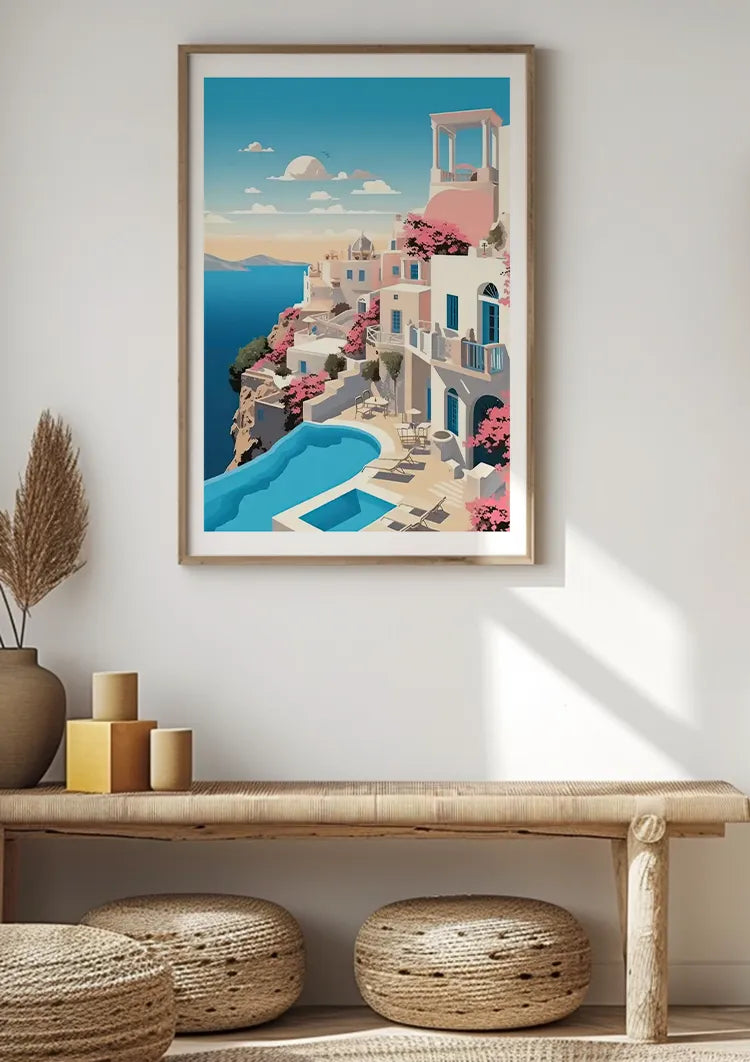 Dette maleri indfanger charmen ved en idyllisk kystby med hvide bygninger og lyserøde bougainvilleaer, balkoner med udsigt over havet under en strålende blå himmel. Det udstråler en atmosfære af ro og skønhed.