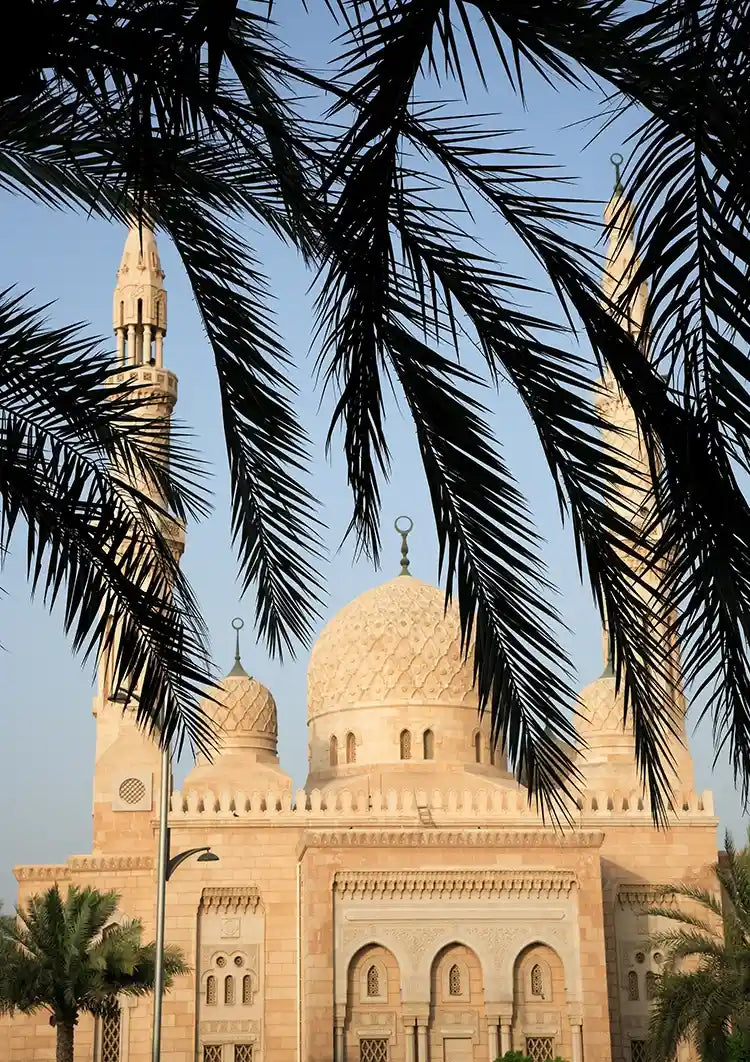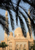 Dette maleri forestiller en moské med udsmykket arkitektur, indrammet af silhuetten af palmeblade mod en klar himmel.