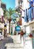 Dette maleri viser en solrig middelhavsgade med hvide bygninger, dekoreret med hængende vasketøj og potteplanter.