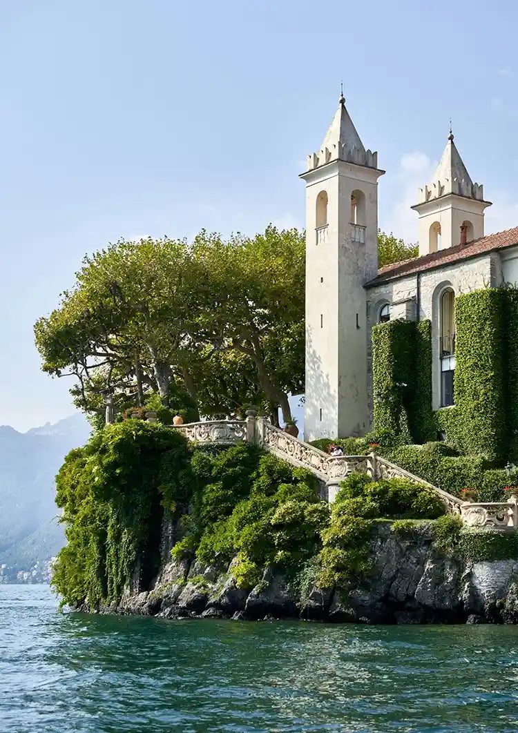 På dette maleri ser du en ø med et stort hvidt tårn.