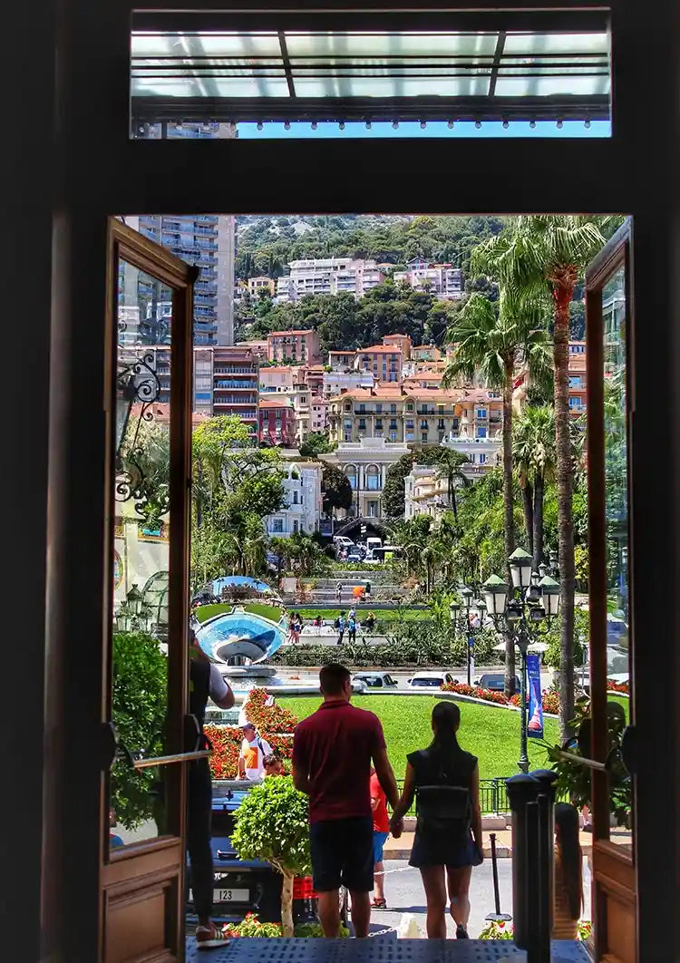 Dette maleri forestiller en mand og en kvinde, der holder hænder og går væk med udsigt over et område med grønt, palmer og en bjergrig baggrund.