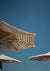 Dette maleri viser tre vævede, stråfarvede parasoller mod en klar blå himmel.