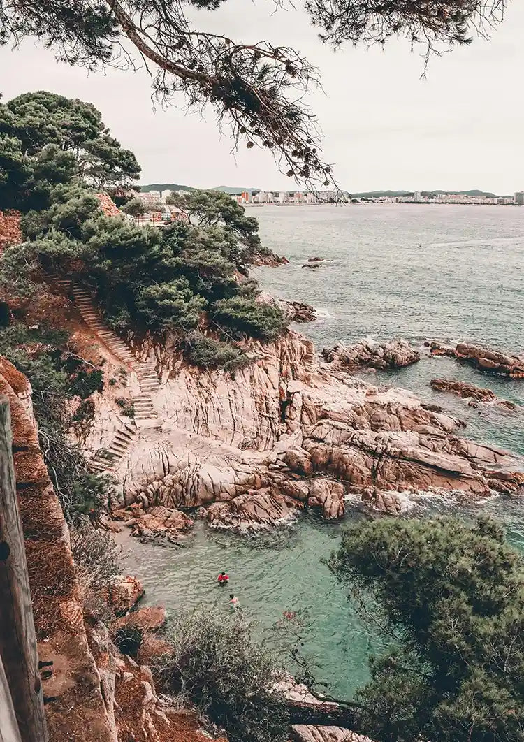 Dette maleri viser et kystlandskab med klippefyldte klipper og klart turkisblåt vand.