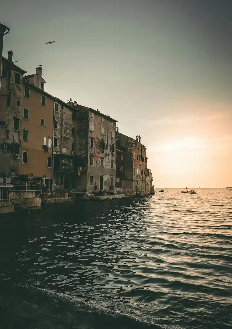 Dette maleri viser gamle bygninger med vejrbidte facader langs havnefronten ved solnedgang.