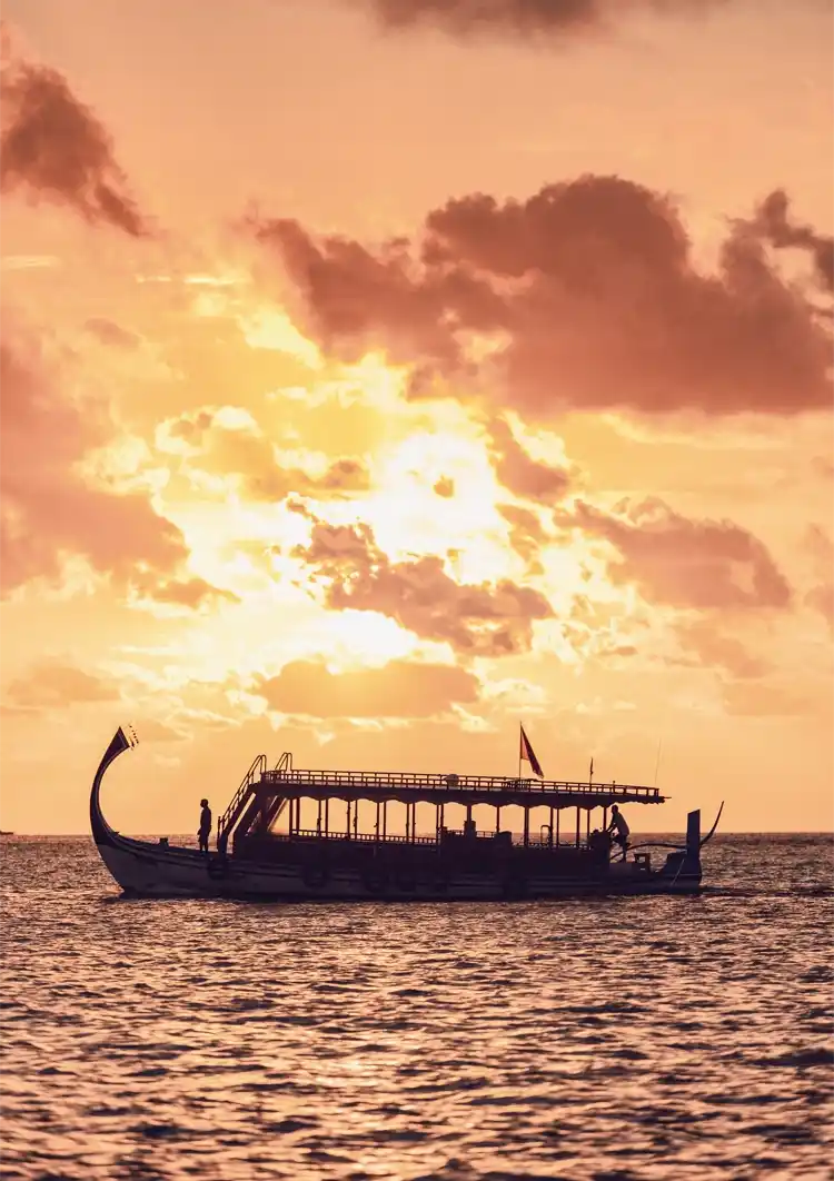 Et maleri af silhuetten af en særlig båd med en smuk farvet himmel bagved.