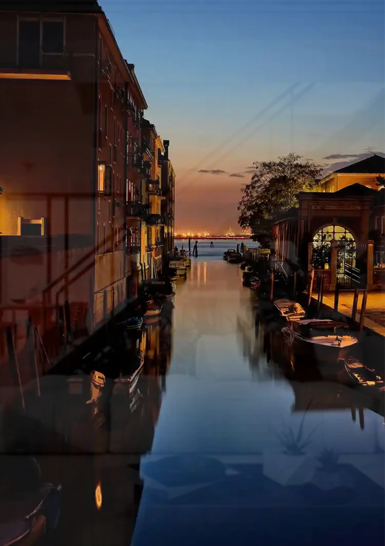 Dette maleri viser en rolig solnedgang over en venetiansk kanal,