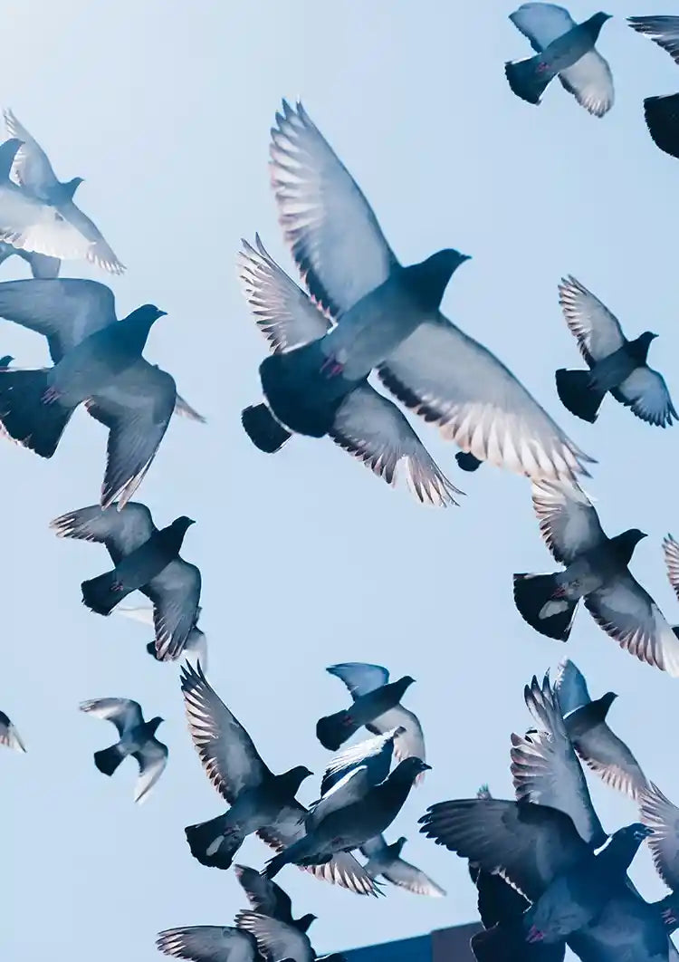 Dette maleri viser en flok duer i flugt mod en klar blå himmel.
