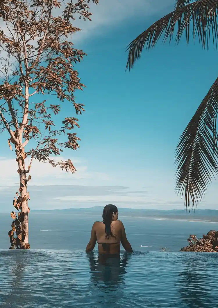 Dette maleri forestiller en figur set bagfra, der ligger tilbagelænet i en rolig infinity-pool med udsigt over et stort hav og en klar himmel, omgivet af et træ og palmeblade.