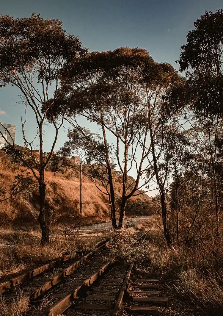 Hvorfor du bør vælge Maleri af forladt jernbanelinje omgivet af træerTuinposter