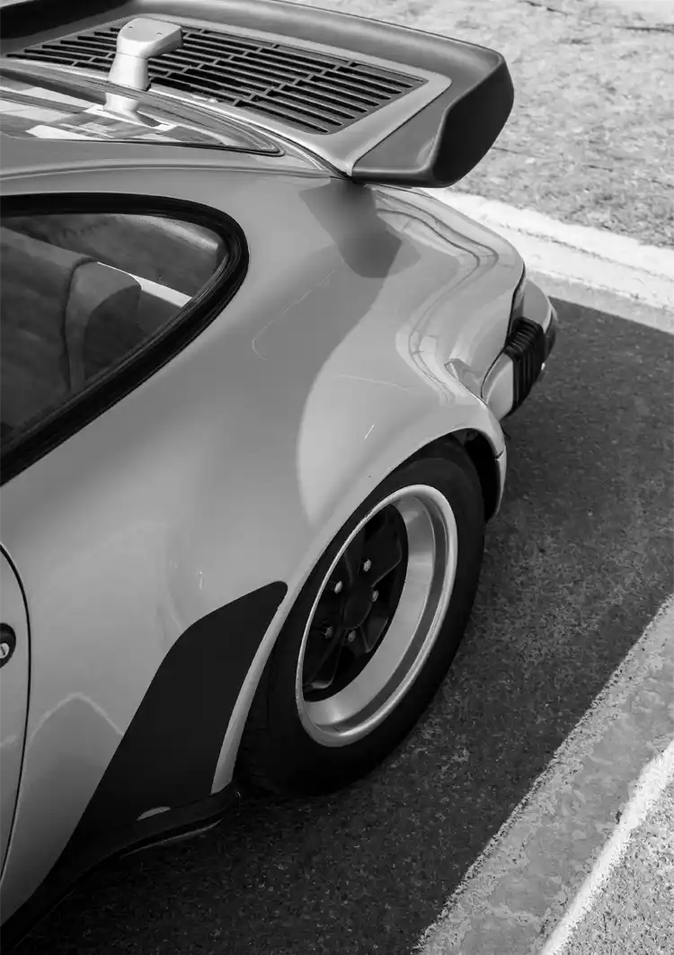 Dette maleri viser et sort-hvidt fotografi af bagsiden af en Porsche Carrera, der fremhæver det afrundede design, de store hjul og den iøjnefaldende hækspoiler, parkeret langs en vej.