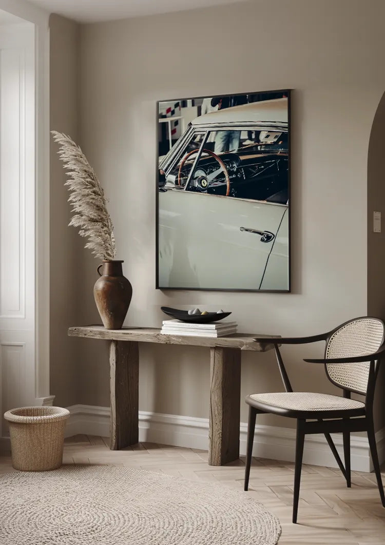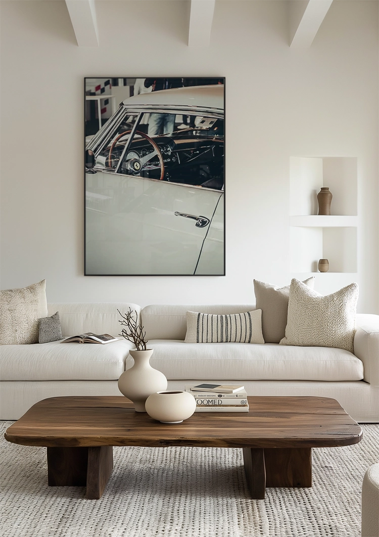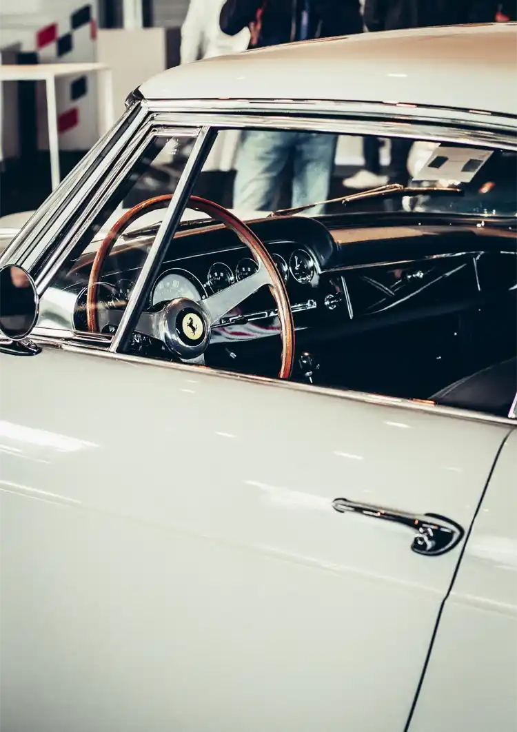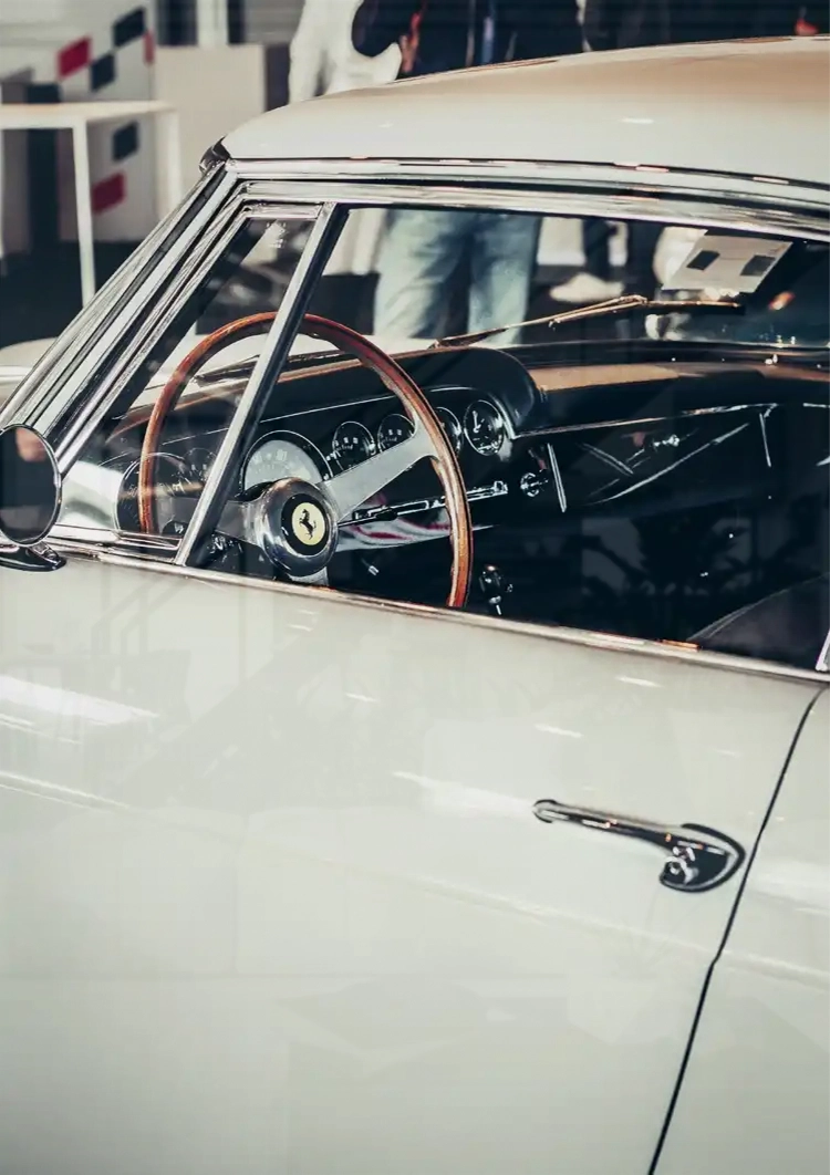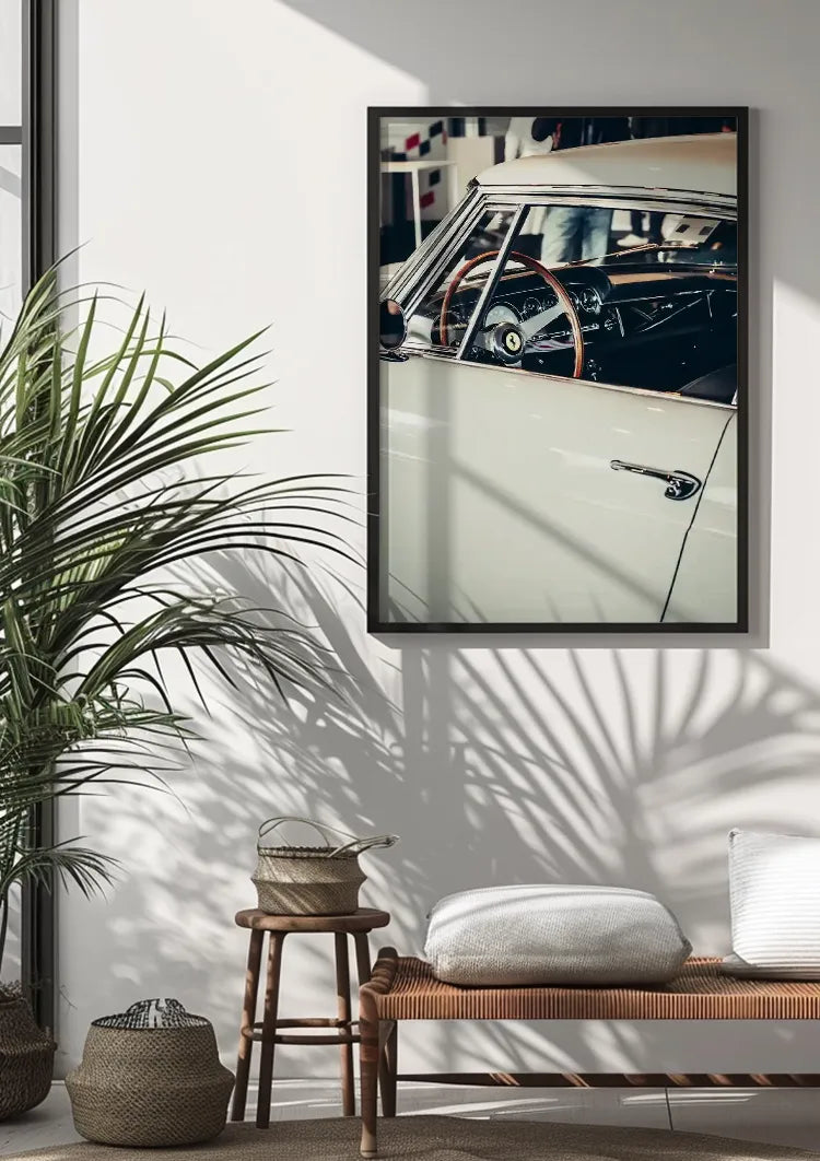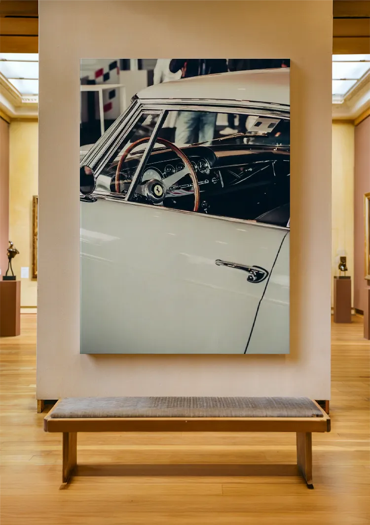 Dette maleri viser det smukke interiør i en smuk Ferrari. Bilen har et smukt klassisk trærat med aluminiumsdetaljer og det ikoniske gule Ferrari-logo i midten.