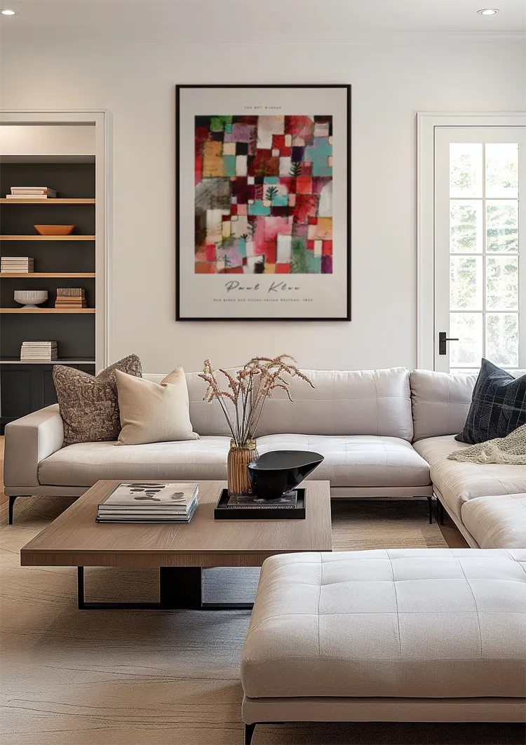 - Kunst over sofaen? Vælg en bredde på mindst 100 cm. Det kan være ét stort værk, eller et kombination af to eller tre mindre værker ved siden af hinanden.