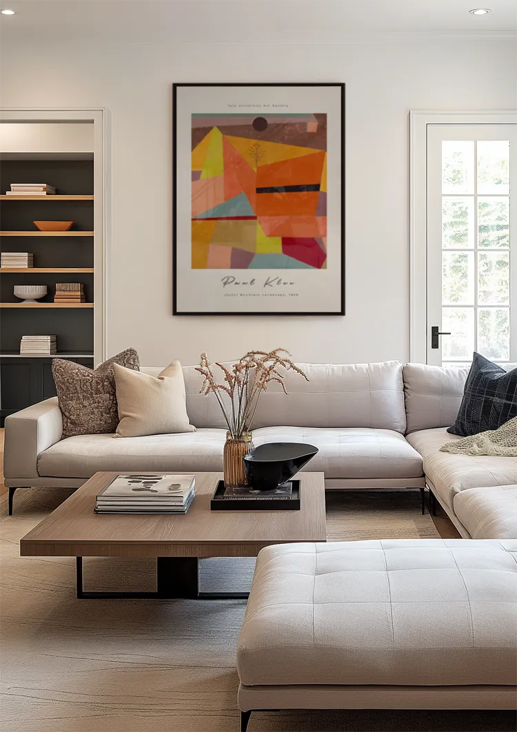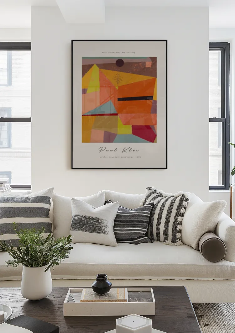 - Kunst over sofaen? Vælg en bredde på mindst 100 cm. Det kan være ét stort værk, eller et kombination af to eller tre mindre værker ved siden af hinanden.