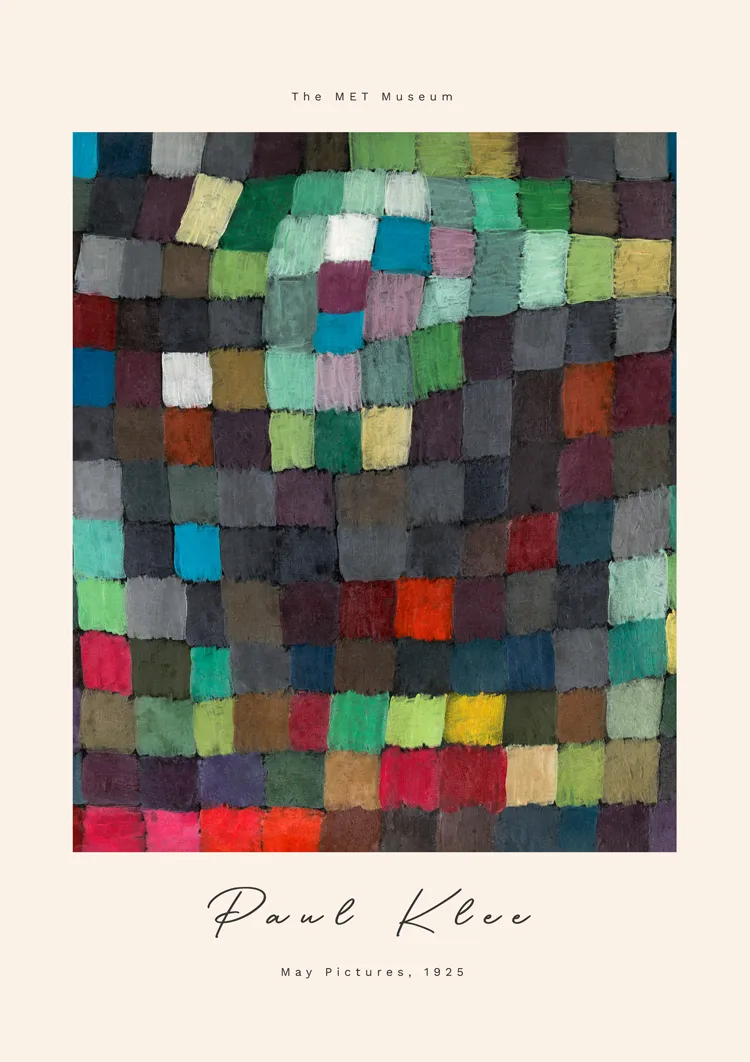 Dette maleri "Majbilleder 1925" af Paul Klee består af et gitter af farverige firkanter og rektangler i forskellige nuancer.