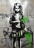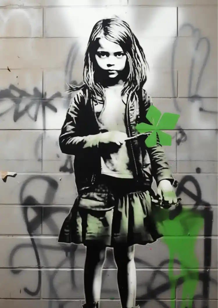 Dette maleri forestiller et graffitikunstværk af en ung pige i en kjole med en grøn firkløver, med graffiti.