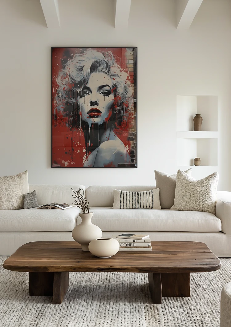 Dette maleri viser et levende sort-hvidt portræt af en kvinde med stænk af rød og hvid maling.